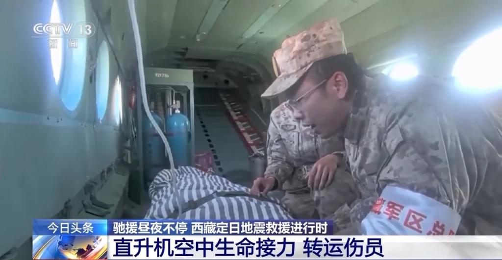 记者 李笑琪:这里是西藏定日县长所乡卫生院前方空地,西藏军区紧急出动的直升机已经缓缓降落在此,医护人员正在将伤员从救护车紧急转运到直升机上。